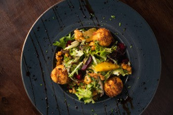 Grilled goat’s cheese on a bed of mixed leaves, caramelised