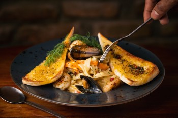 Served in a white wine & garlic cream broth with homemade brown bread.