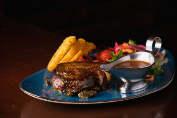 Pan-fried 60z Hereford steak served with sautéed mushrooms &