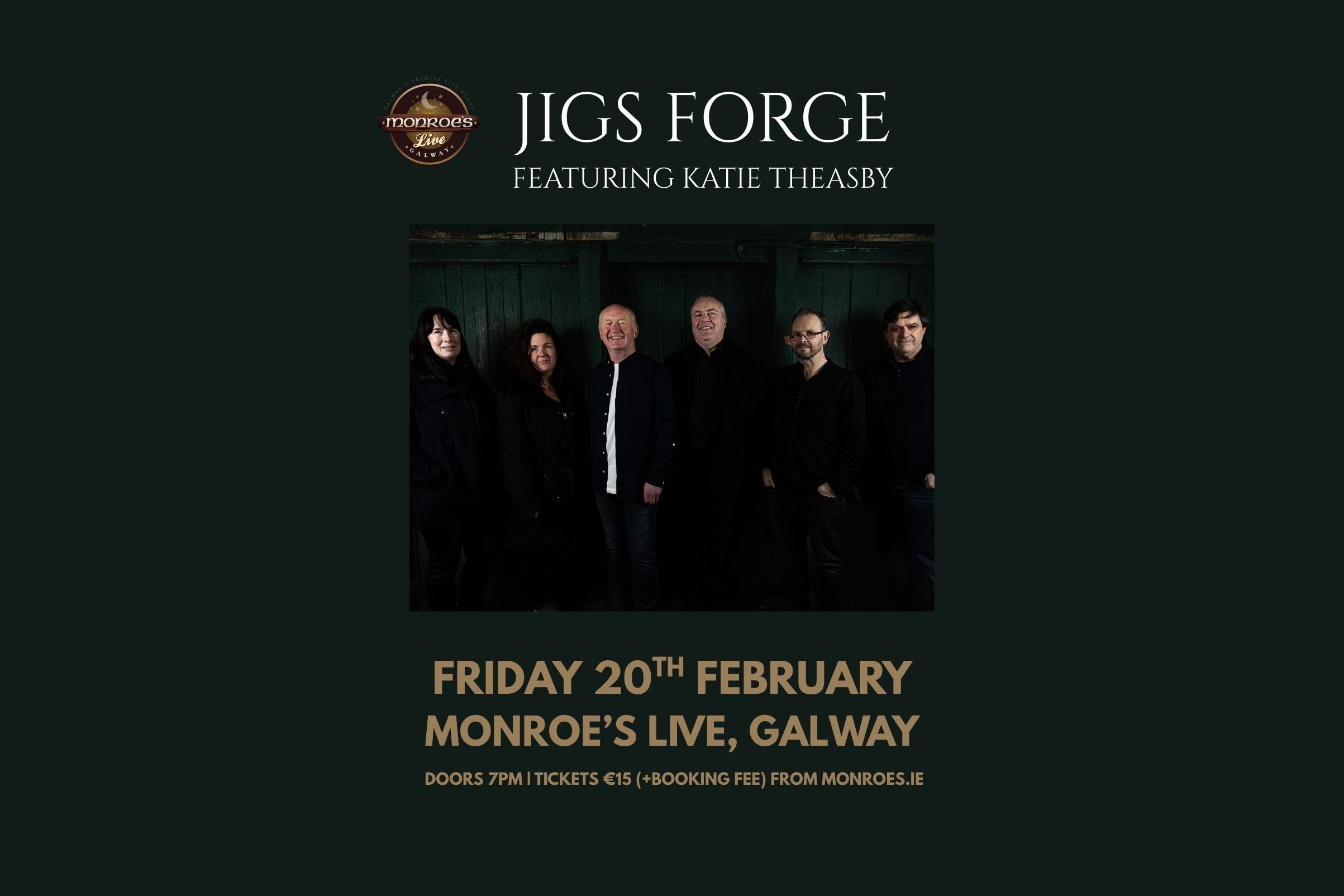 Jigs Forge are: Dave Sanders fiddles, vocals, Katie Theasby vocals, flute, whistles, Mary Liddy, concertina, Felim O’Coileáin keyboards, guitar, vocals, Fintan O’Malley percussion, guitar, vocals and Alan Wallace electric and acoustic guitars.